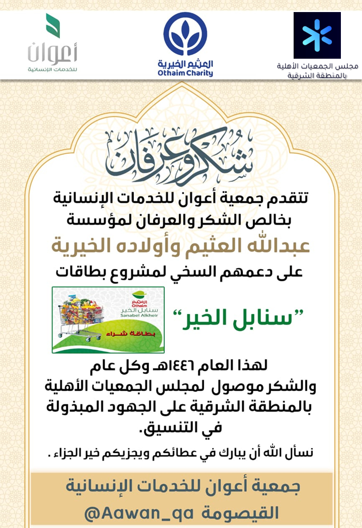 تتقدم جمعية أعوان للخدمات الإنسانية بخالص الشكر والعرفان لمؤسسة عبدالله العثيم وأولاده الخيرية على دعمهم السخي لمشروع بطاقات “سنابل الخير” لهذا العام 1446هـ والشكر موصول لمجلس الجمعيات الأهلية بالمنطقة الشرقية على الجهود المبذولة في التنسيق.